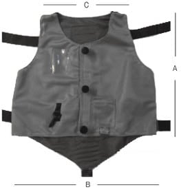 Støtter brugers overkrop. Vesten har 6 fikseringsgjorde samt lynlås. Gjordene er nemme at klikke af og sikrer sammen med lynlåsen, at vesten er nem at give bruger på og tage af.