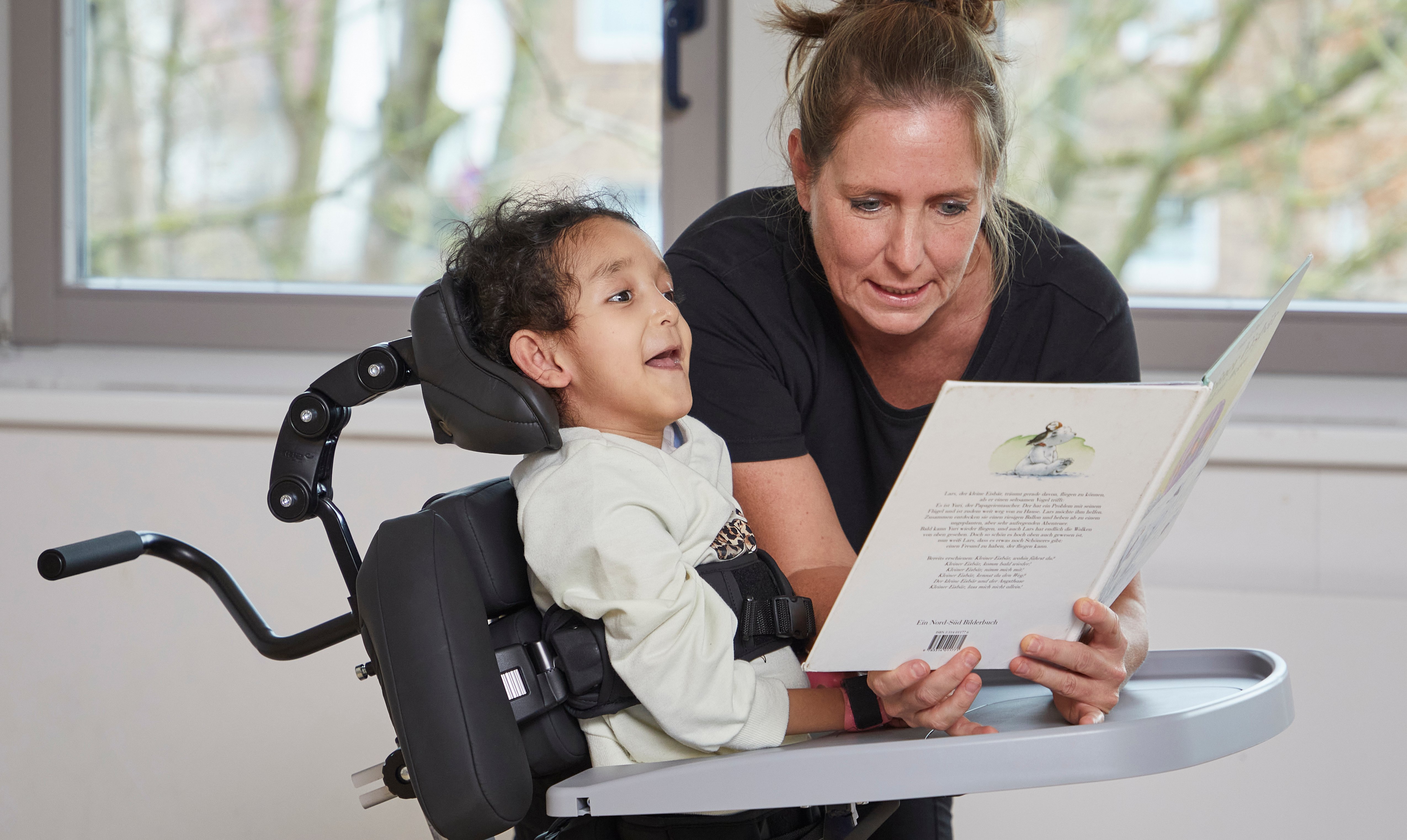 Standing takes a lot of energy for Zahra, so tilting the Addax and making sure she is not positioned fully upright allows her to save her energy. Zahra is enthusiastic about her standing sessions and shares a strong bond with Wencke. Together they enjoy reading stories and drawing colourful pictures.